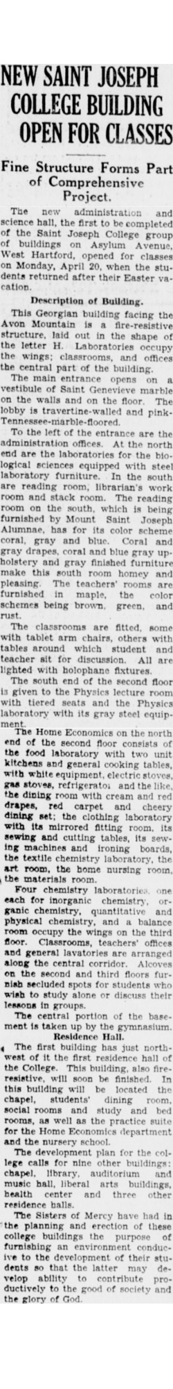 Did you know that students did not attend the Asylum Ave campus until 1936 even though the University of Saint Joseph was founded in 1932? In honor of Women’s History Month, read the Catholic Transcript newspaper clipping below from April 23, 1936, to learn about the campus’ newly constructed buildings designed by the Olmsted Brothers Firm. The building described in the article is today’s McDonough Hall.
