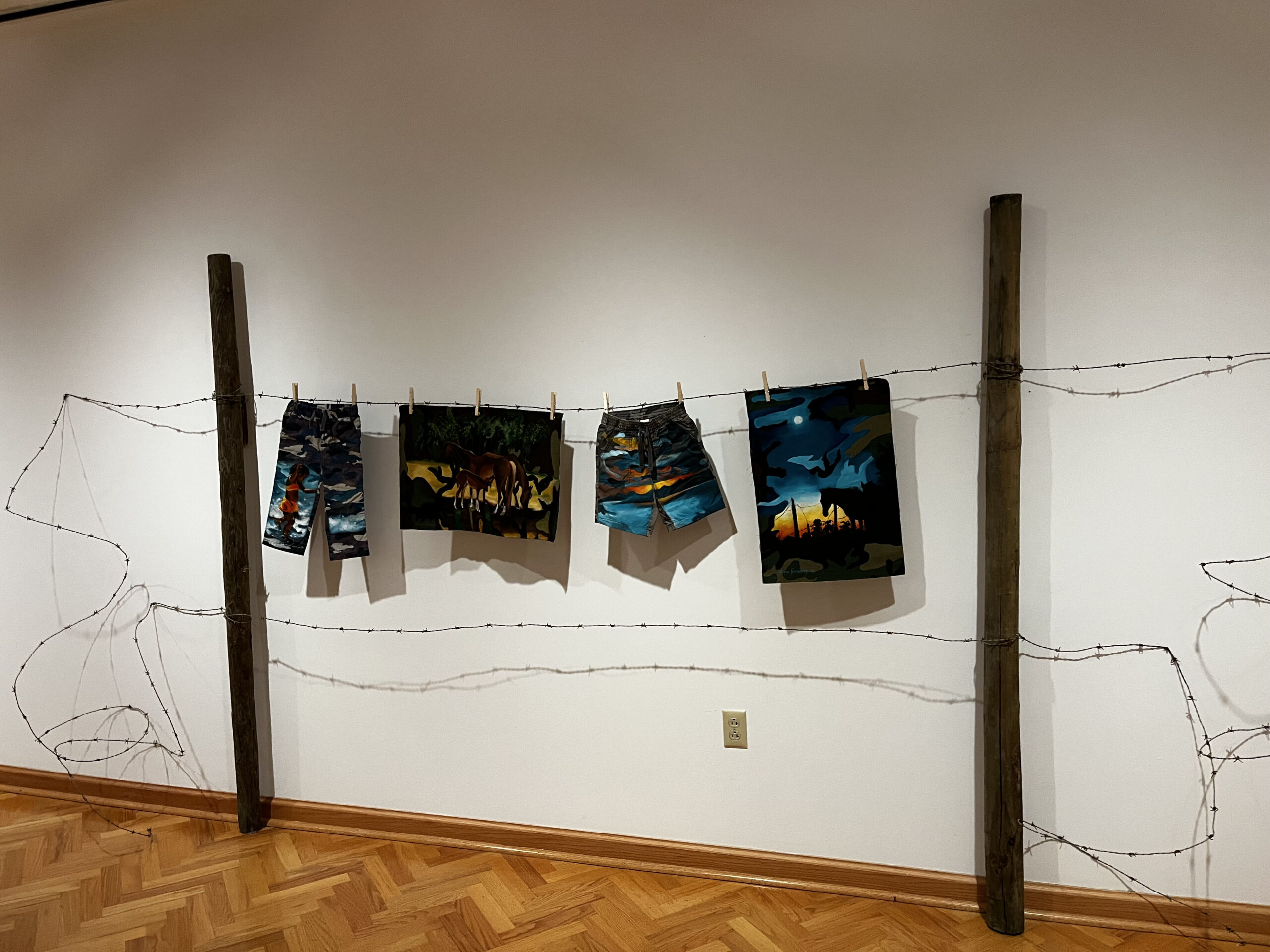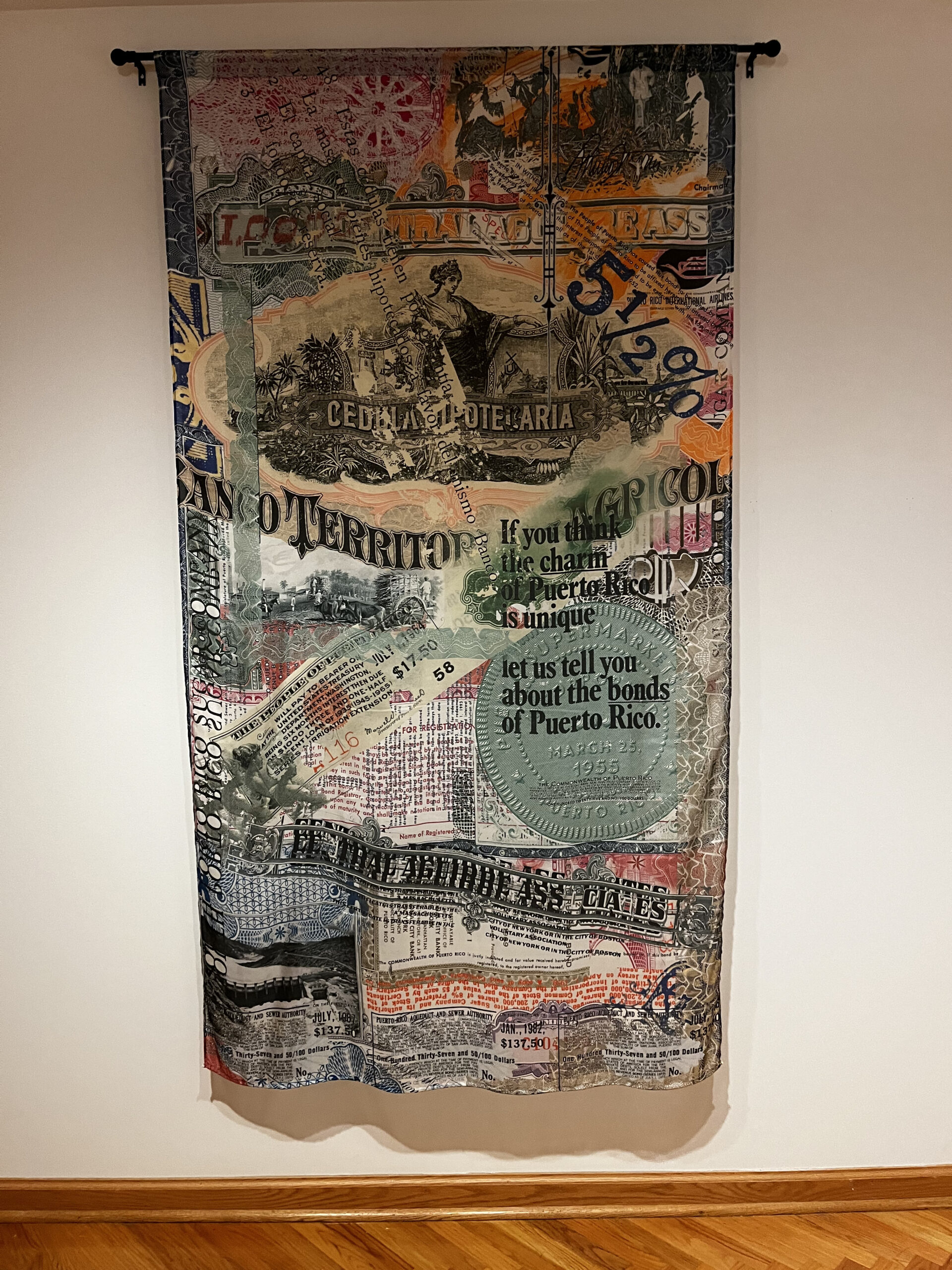 In addition to Martorell’s work, the purchase party included pieces from Yasmín Hernández and Carolina Caycedo. Hernández’s piece, “Bieké Sobresaliente,” was also three-dimensional, featuring a full-sized barbed wire fence. From the barbed wire dangled pairs of swimming trunks, upon which beautiful nature scenes were painted. Caycedo’s piece “Let Us Tell You About the Bonds of Puerto Rico” invokes themes of capitalism and money. She references a 1970s advertising campaign for the Government Development Bank of Puerto Rico in order to examine the ways that economic colonialism prioritizes the needs of tourists over the needs of the Puerto Rican people.