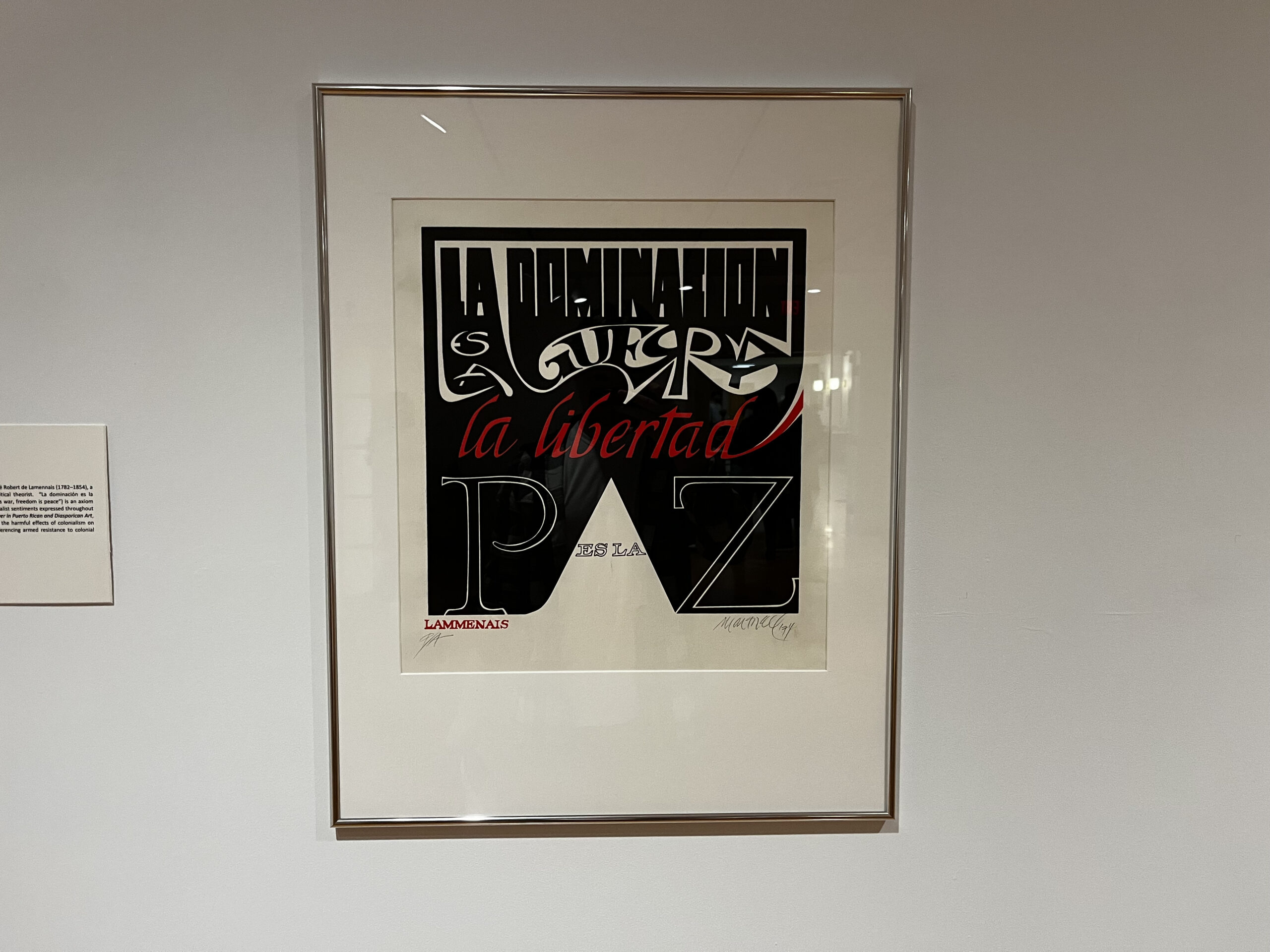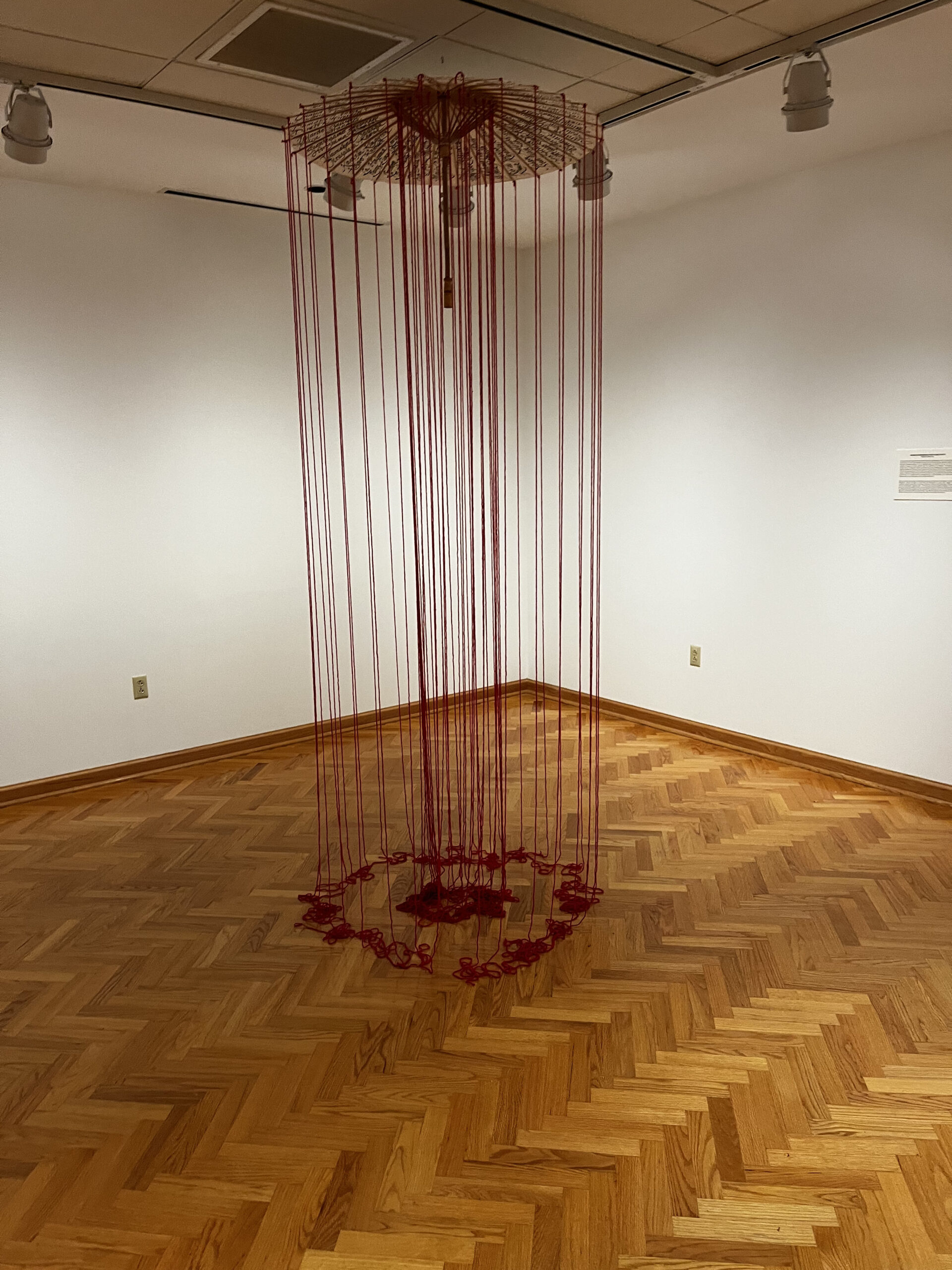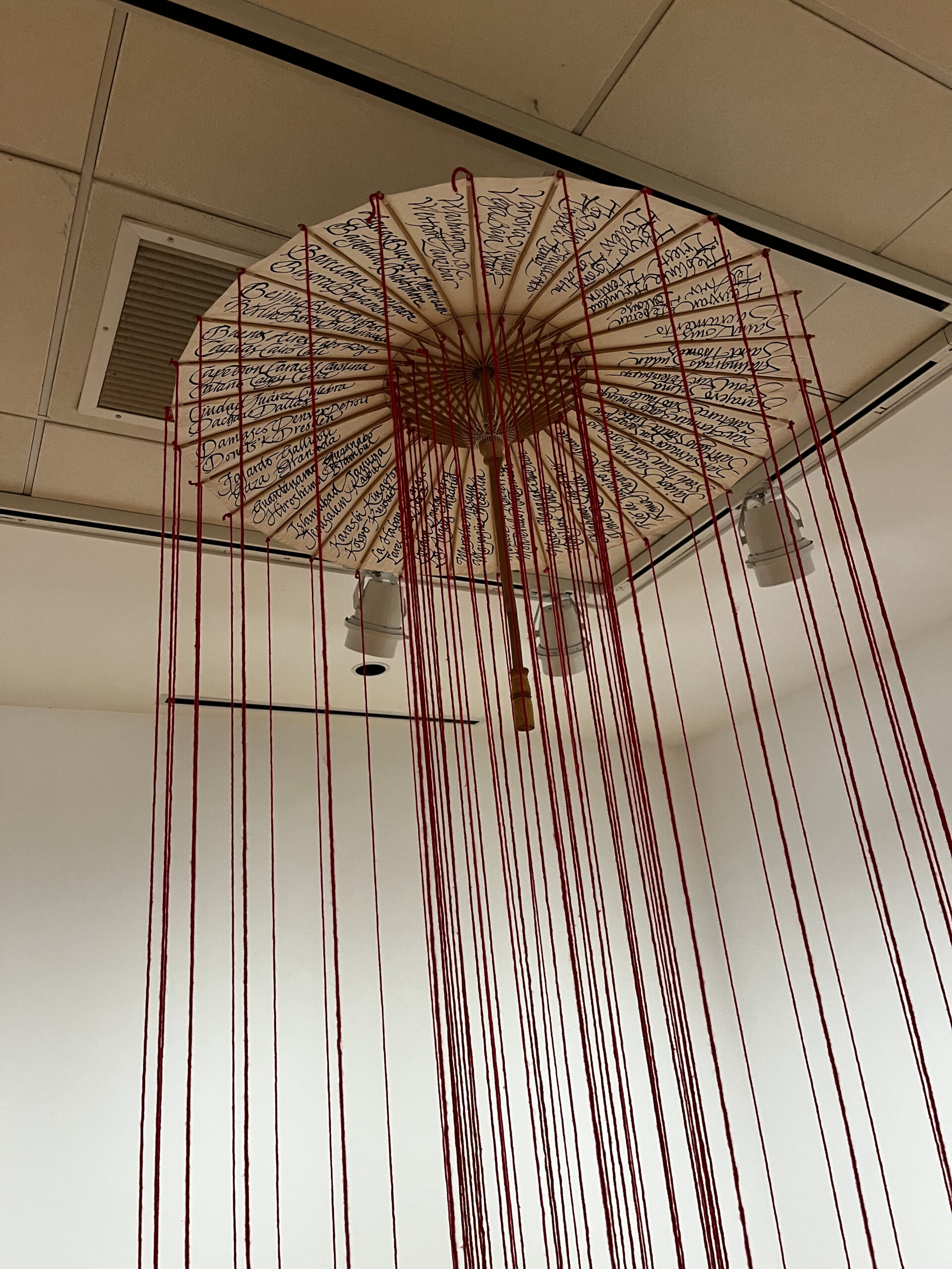 In addition to “Bestiarium Politicum Portoricensis,” Antonio Matorell is the creator behind two other pieces in the exhibit: “Cita de Lammenais” and “Lluvia de sangre.” Each of them serves as a commentary on war and political violence. “Lluvia de sangre” is a three-dimensional piece in which an umbrella is suspended from the ceiling. Hanging from above the umbrella are a multitude of red strings intended to symbolize blood. The underneath of the umbrella is labeled with the names of various sites of violence from around the world.