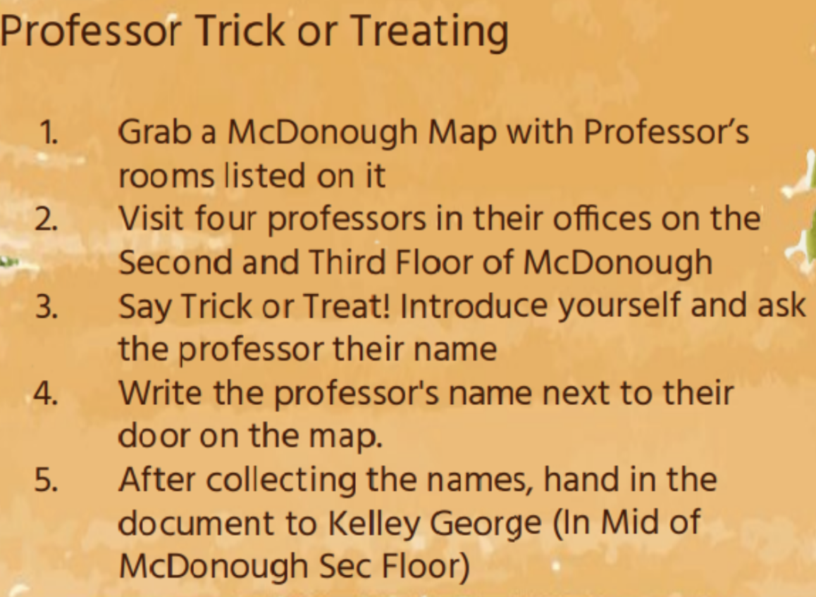 On October 21, the lovely professors held an early Halloween event where you could go up to the second and third floors of McDonough and say “trick or treat” for some candy. However not every professor was handing candy out and those who were participating had a little ghost picture beside their door.