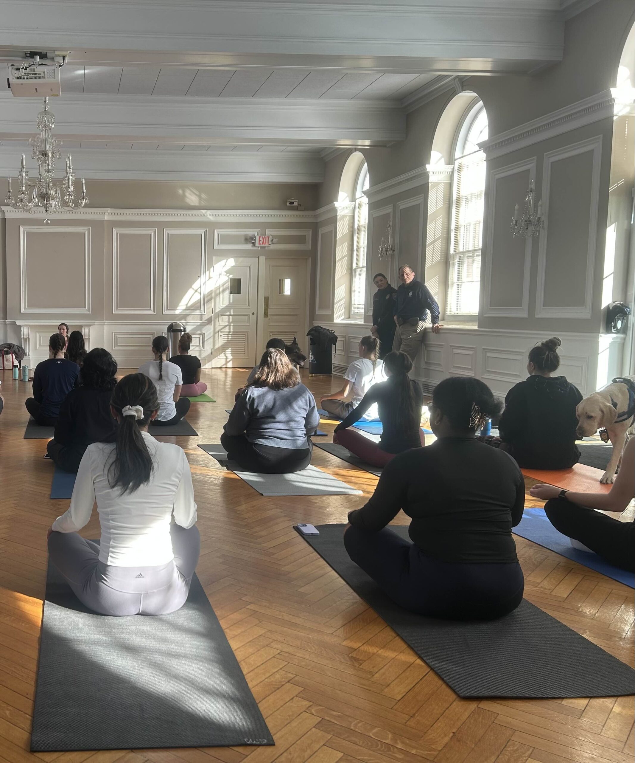 This event was done by reservation. A maximum of 28 attendees would be provided with yoga mats, but more people were welcome to come if they brought their own mats. There were three dogs walking around named Tao, Heidi, and John. Tao came with the Dog Yoga company, Heidi with Officer Richard Simons from Yale Police, and John with Officer Stephanie Masella from the Meriden Police. There were stickers handed out at the event as well.