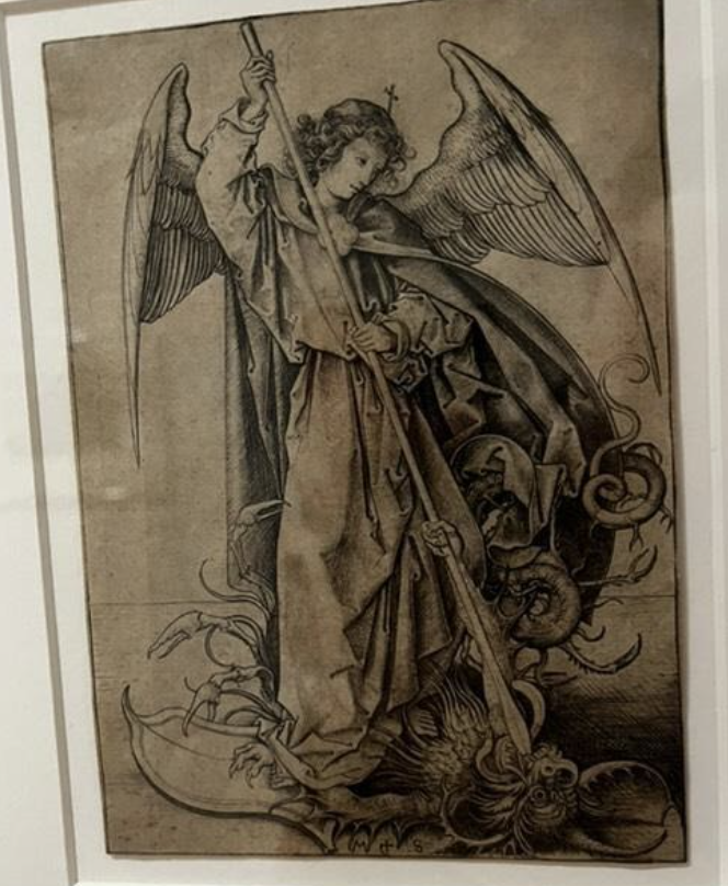 While I did not go to the museum myself, I am thankful that my wonderful newspaper comrade was able to take many pictures so that we can discuss some of the images. When I was viewing all of the artists and the amazing pieces they presented, I noticed that almost all of them were in darker shades. They also seemed to be of organic shapes yet so detailed that you can see every line or wrinkle in the image that they are depicting. For example, Martin Schongauer’s take on “Saint Michael” was so detailed that you could see each of the wrinkles in the archangel’s robe as well as each individual feather of their wings. Even the devil, who Michael is displayed spearing, is extremely detailed and precise, which we can see in the face. While I am not one for religious depictions, I found this image very interesting and it reminded me of the old medieval drawings that they used to do where the death of someone was very detailed. Considering this, I took a look at the dates that the pieces were created and it seems that many of them were created in the 1400- 1500’s. Since I was curious to what was happening during this time, I did a brief search on the internet and found out that this was the era in which the Renaissance was, which made sense as to why the overall style of the images in the Art Museum gave me that impression.